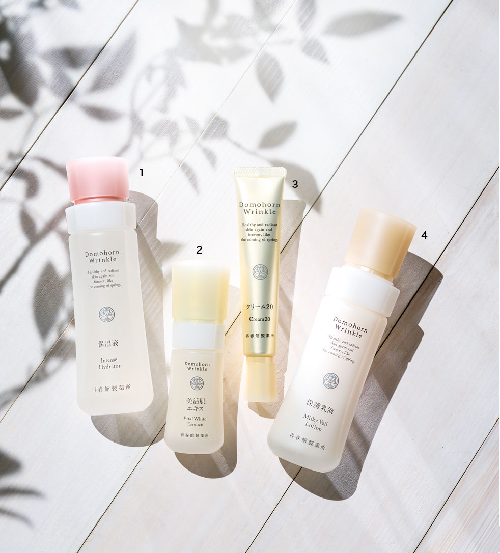肌に本来備わっている、健やかになる力をサポート。なりたい肌への最短距離となる[基本4点]。1.こわばった大人肌にもすっとなじむ、とろみあるテクスチャー。手のひらに吸いつくほどのみずみずしさは感動もの。保湿液 120mL ¥5,500、2.醗酵というひと手間を加えた漢方発想で得られたナイアシンアミドを配合。シワを改善、シミ※1を予防。美活肌エキス[医薬部外品]販売名:ドモホルンリンクル 薬用美容液b 30mL ¥11,000、3.「手放せない!」と絶賛するファンが多いコラーゲン※2ケアの傑作。クリ ーム20[医薬部外品]販売名:ドモホルンリンクル 薬用クリームb 30g ¥14,300、4.分子量の大きなハモコラーゲン※3を配合し、潤いを逃さない極上ベールを形成。余分な皮脂を吸着するシルクパウダー入りだから、メイク前に使っても表面はサラリ快適。保護乳液 100mL ¥5,500