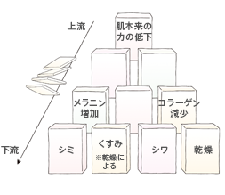 シワができたり、シミが気になったり……大人なら、次々と出てくる肌悩みを前に、途方にくれた経験があるもの。でも、肌表面に現れるたくさんのトラブルも、つきつめれば根はひとつ。肌本来の力の低下という上流のトラブルが、まるでドミノのように下流の肌悩みを生み出すのです。悩みの根本に働きかけ、きちんと自ら潤う肌へと導くこと。そんな「先回りケア」こそが大切なのです。