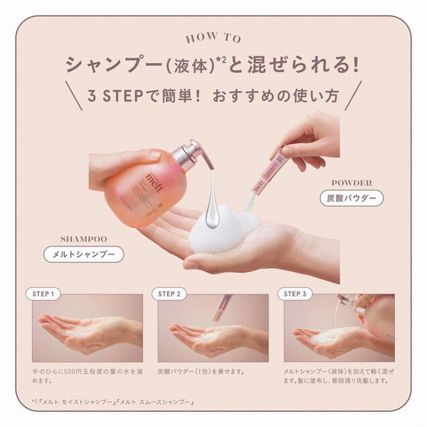 とろふわの濃密泡や、パチパチと泡のはじける音の生炭酸(*1)シャンプーなど、さまざまな感覚に働きかけるmeltのヘアケアで自分を大切にするバスタイムを。
