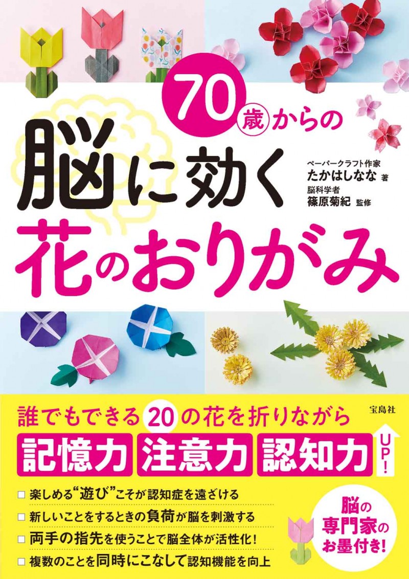 もの忘れや認知症予防にはおりがみが効果的。指先を動かし完成まで取り組む集中力、工程の意味を把握する理解力、角と角を合わせてきっちり折る注意力、出来上がりをイメージし紙や色を選ぶ思考力など、様々な脳の力をトレーニングできます。美しく素敵な作品に定評のある、おりがみ作家のたかはしななさんが考案した、季節を感じられる花のおりがみを誰でも簡単に折れるようになる一冊です。