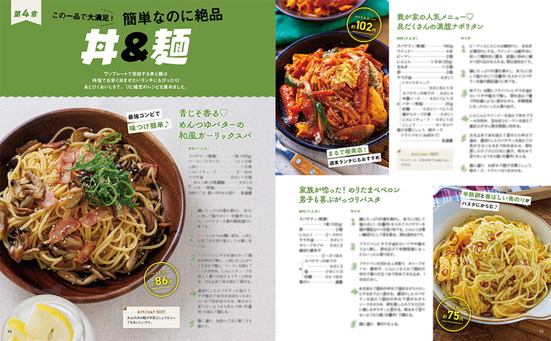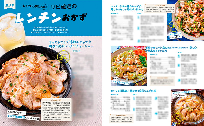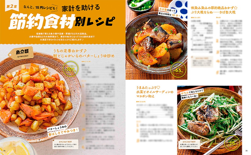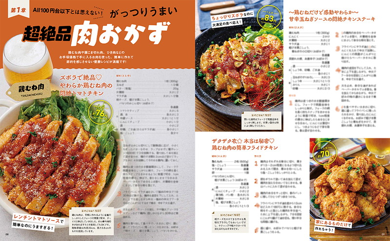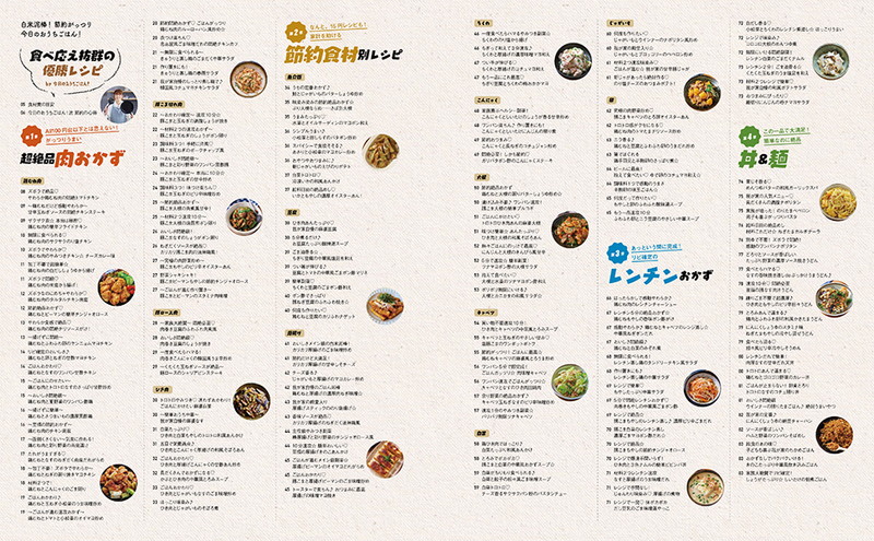 鶏むね肉や豚こま切れ肉などの低価格なお肉を使った「肉レシピ」、豆腐や厚揚げなどの大豆製品や白菜や大根などの大物野菜を使った「節約食材レシピ」、節約だけでなく、時短も叶える「レンチンレシピ」、一品で大満足間違いなしの「丼&麺レシピ」、サッともう一品に便利な「副菜&おつまみレシピ」など、第1弾・第2弾よりもさらに盛りだくさんの内容でお届けします!