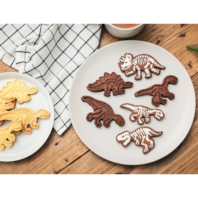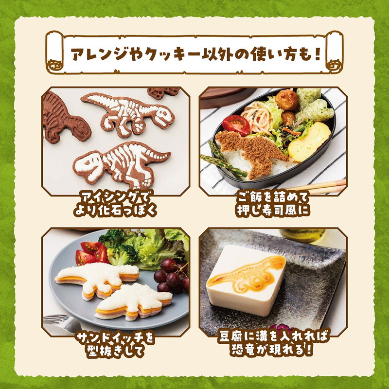 骨格が作れる押し型もセットになっていて、溝にアイシングをすれば、より化石のようなクッキーが作れます。クッキー型としてはもちろん、お弁当やサンドイッチ、お豆腐などにも使用できます。