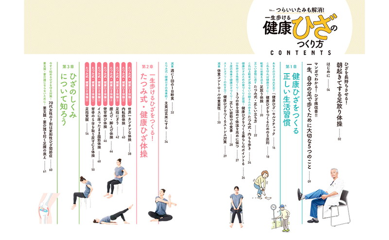 本誌では「手術なしでひざ痛を治す」スペシャリスト巽一郎先生が考案した「長持ちひざ」のつくり方を紹介。痛みを和らげるマッサージや体操をはじめ、食事の改善、毎日の習慣などをわかりやすく解説します。