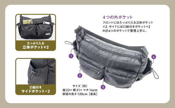 →表にはファスナー付きのたっぷり入る立体ポケットが2つ