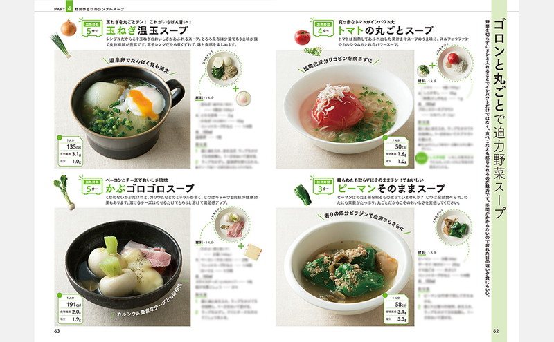 作り方は食材を切ってチンするだけ。調理が億劫になる時季でも毎日飽きずに食べられます。管理栄養士監修なので、栄養バランスもばっちり。食欲不振に効く食材を使ったスープや、肉・野菜のバランスがよく食べ応え満点のごちそうおかずスープ、いつもの献立に追加するだけの一つの野菜スープなど、全85品紹介。