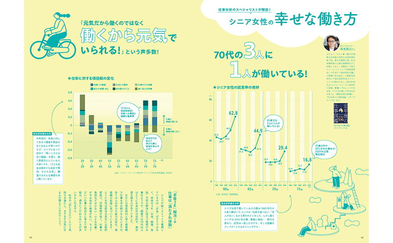 体力・時間・お金で無理をしない、ちょうどいい「小さな仕事」が、この世代の働き方のカギです。働く理由の第1位は、生きがいや社会貢献。自分の生活のためだけでなく、誰かや社会のために意欲的に働く人が多数。働くことで元気になり、自然と体力がアップする趣味を始める人もいるようです。そこで本誌では、さまざまな職種でイキイキと働いているシニアの女性を取材し、そのリアルな声をお届けします。