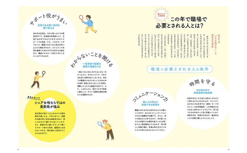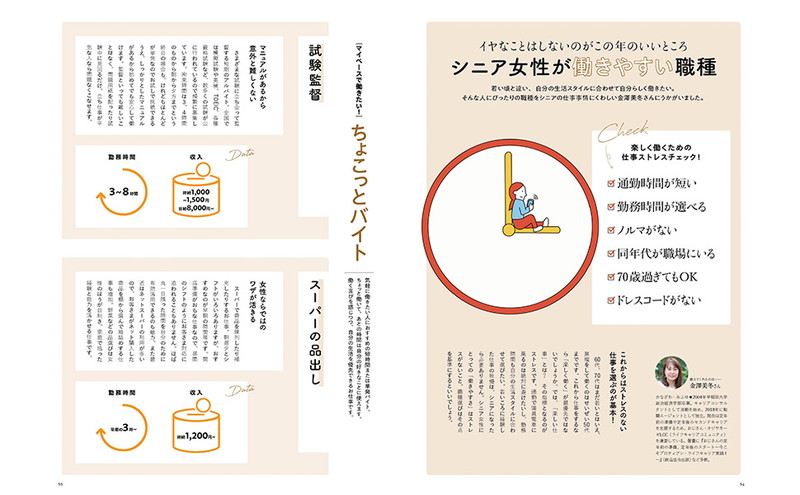 さらに専門家がこれからのシニア女性の働き方事情を分析。この年齢ならではの仕事の特性や探し方、履歴書の書き方の注意点、職場での人間関係を円滑にするための工夫など、実践に役立つ企画も満載の一冊です。