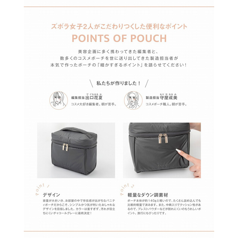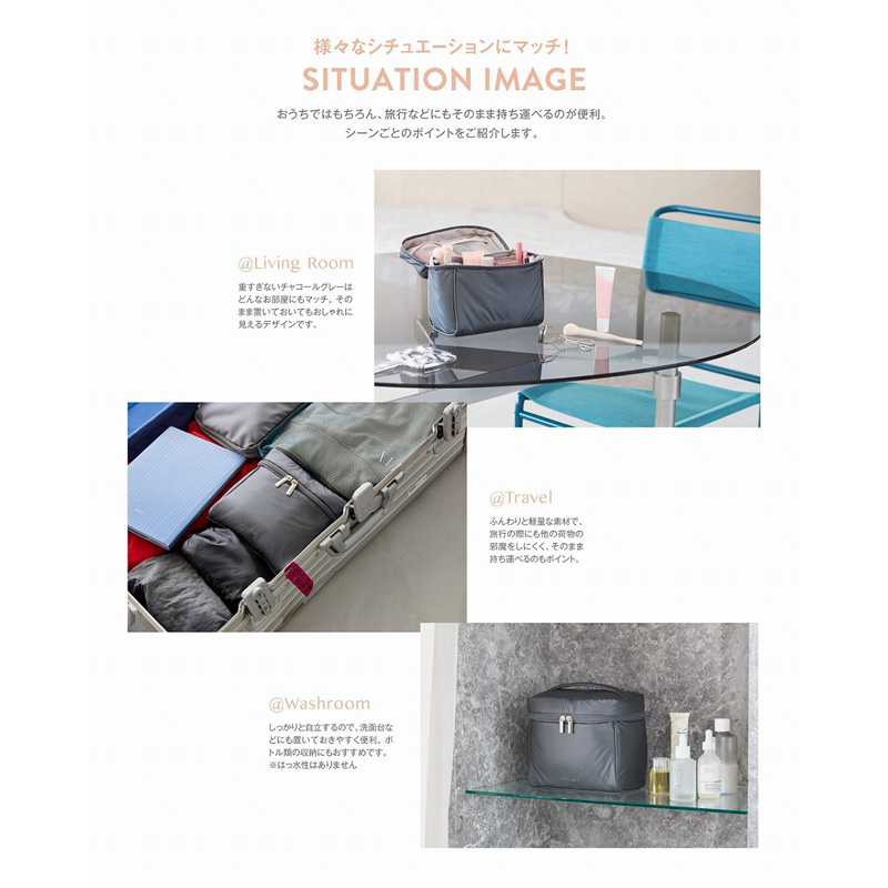 容量が大きい分、お部屋の中で存在感が出がちなバニティポーチだからこそ、シンプルかつ気が利いたおしゃれなデザインを目指しました。カラーは重すぎず、汚れが目立ちにくいチャコールグレーに最終決定!