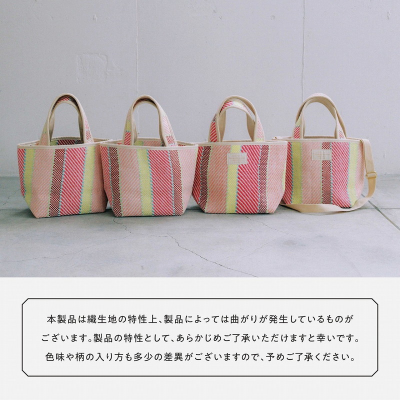 綿糸とPP糸で織りあげられたラフィア調のマルチストライプ生地を使用し、上品な佇まいの風合いあふれるバッグが完成しました!