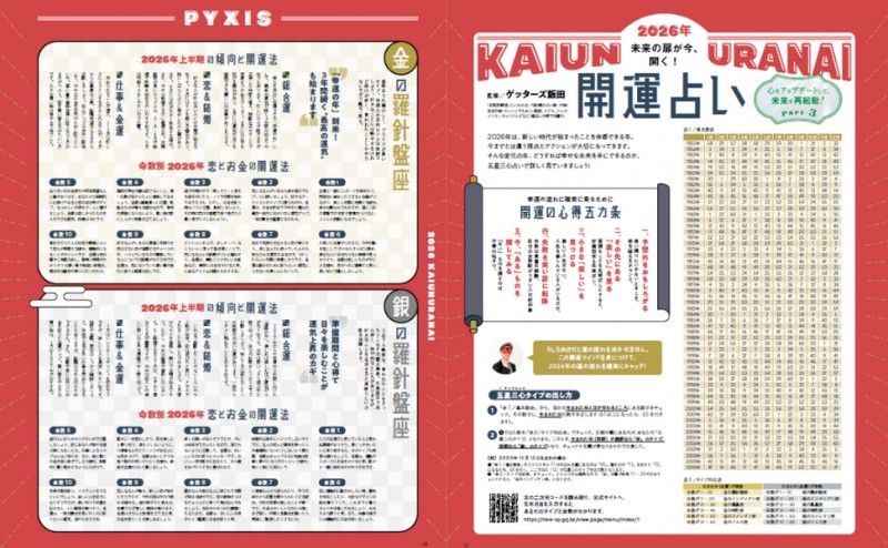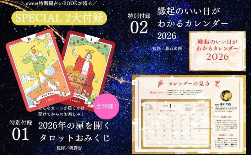 SPECIAL2大付録は、36種類のなかからいまのあなたにぴったりのカードが届く「2026年の扉を開くタロットおみくじ」と、見るだけで運勢上昇日、縁起のいい日がわかる「縁起のいい日がわかるカレンダー2026」。