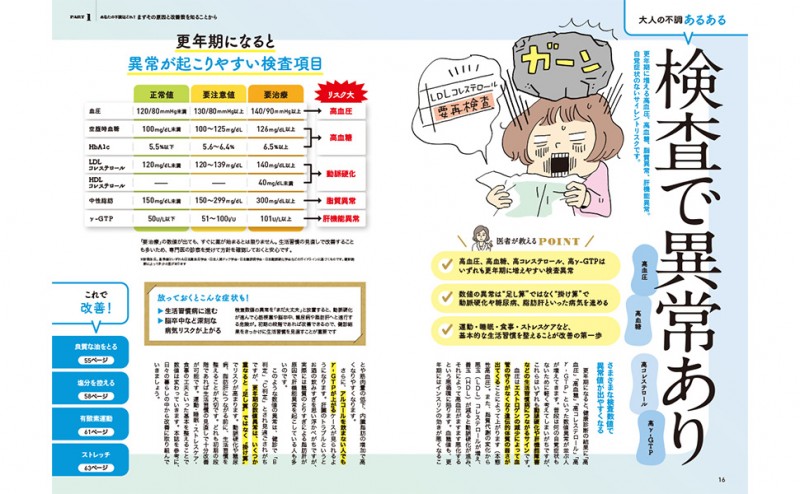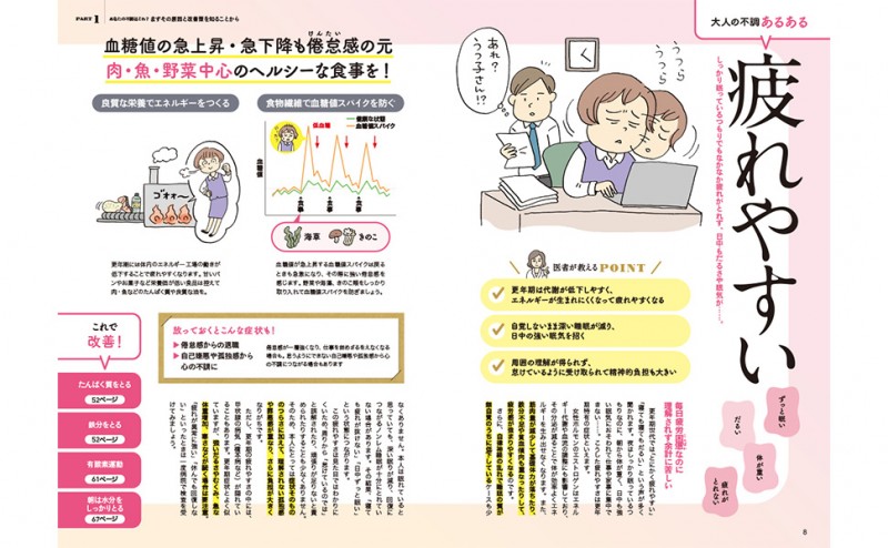 早い人で30代後半からプレ更年期を迎え、症状が落ち着く50代まで、大人の女性の体には不調がつきもの。急激なホルモン変化で、9割近い女性が何らかの不調を感じるといわれています。そこで、日頃感じる動悸やめまい、不眠、イライラなどの不調が更年期とどう関わっているかを専門医が解説、さらに、大人の女性の不調に効く、生活習慣、食生活、メンタルケア、運動なども紹介します。