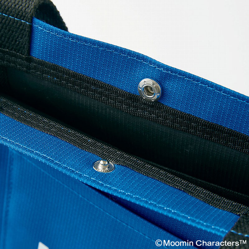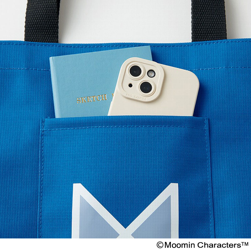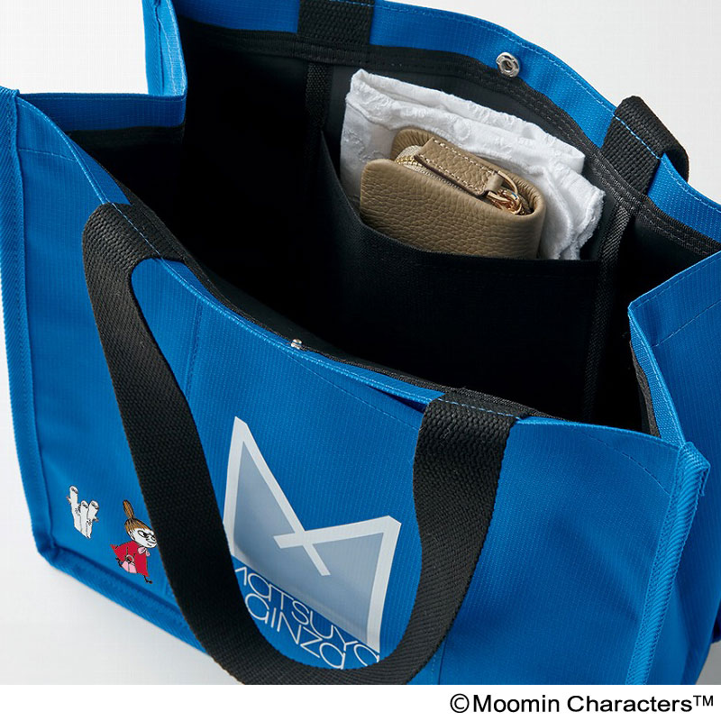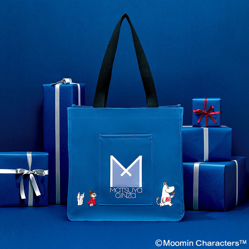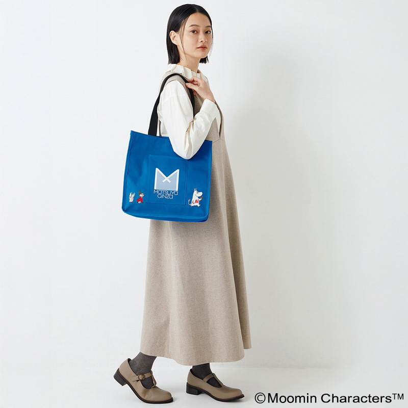 フロントポケットには当時の松屋のロゴ“Mマーク”を配し、前面と後面にはムーミンたちがお買い物を楽しんでいるような愛らしいアートをあしらいました。