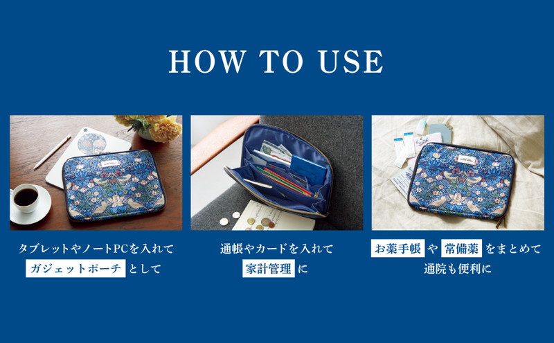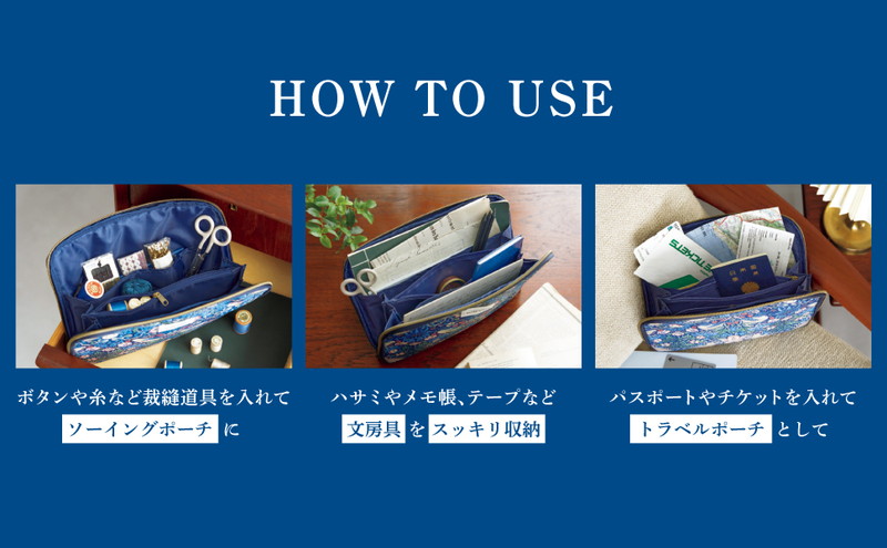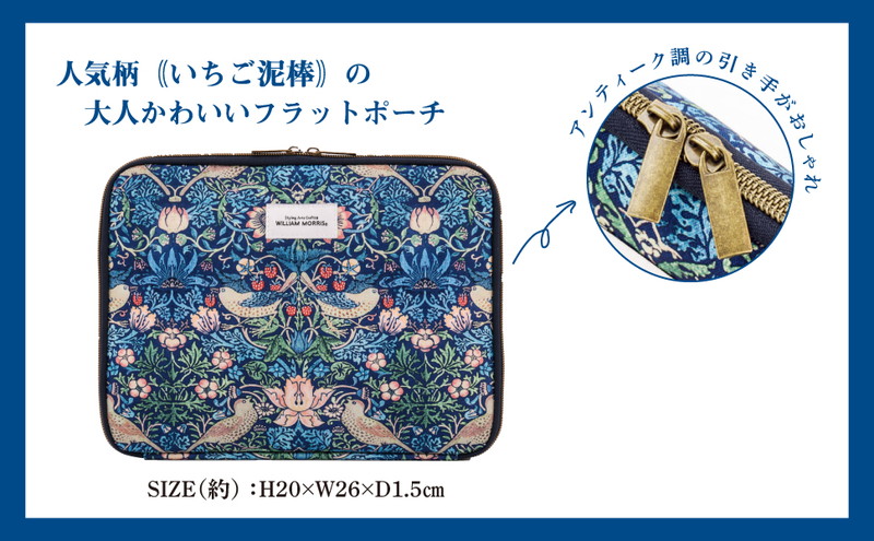 スペシャルアイテムは人気のデザイン「いちご泥棒」を全面に使用した収納ポーチ。たっぷり12個のポケットがついているので、文具や化粧品、裁縫道具など、こまごましたものをすっきり収納できる優秀ポーチです。