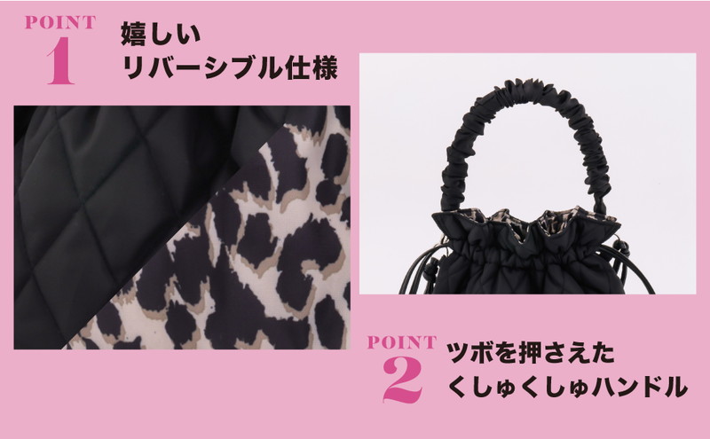 通称「きちんとサイド」のA面は、ぽってりシルエットの愛され系黒キルティング。ひっくり返したB面は、安西さんカラー炸裂のヒョウ柄!