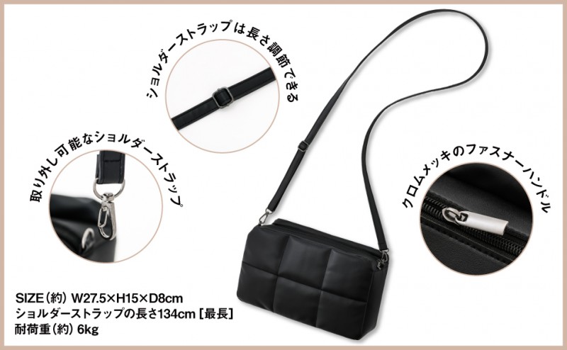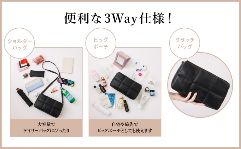 ショルダーストラップは取り外しが可能なので、クラッチバッグやビッグポーチとしても使える3way仕様です。