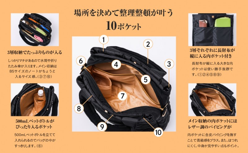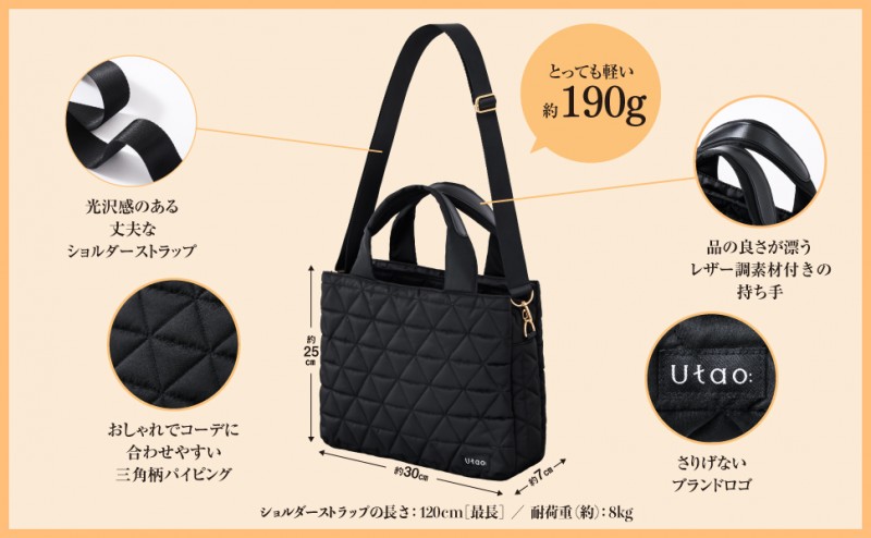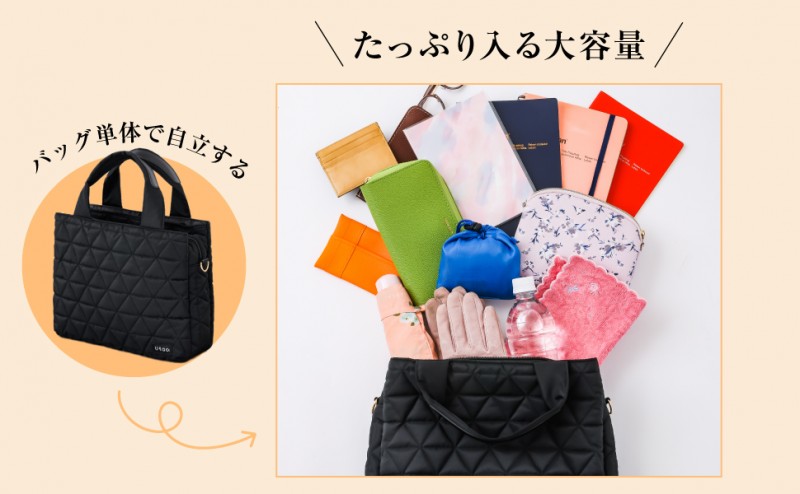 機能性と大人の「上品さ」を兼ね備えた3層キルティングバッグが本誌限定で登場。ショルダーストラップは太く光沢感のある素材にし、レザー調素材付きの持ち手が大人の上品さを演出。撥水加工生地、軽量、整理整頓が叶う10ポケット、明るい裏地など機能性も抜群です。今回は、ハンドバッグとしてもショルダーバッグとしても使える2WAYタイプにしました。