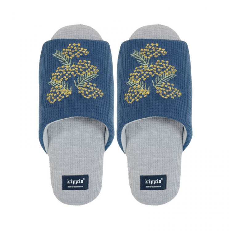 春のお部屋を明るくするミモザ刺繍のスリッパ。ワッフル生地で柔らかな履き心地です。