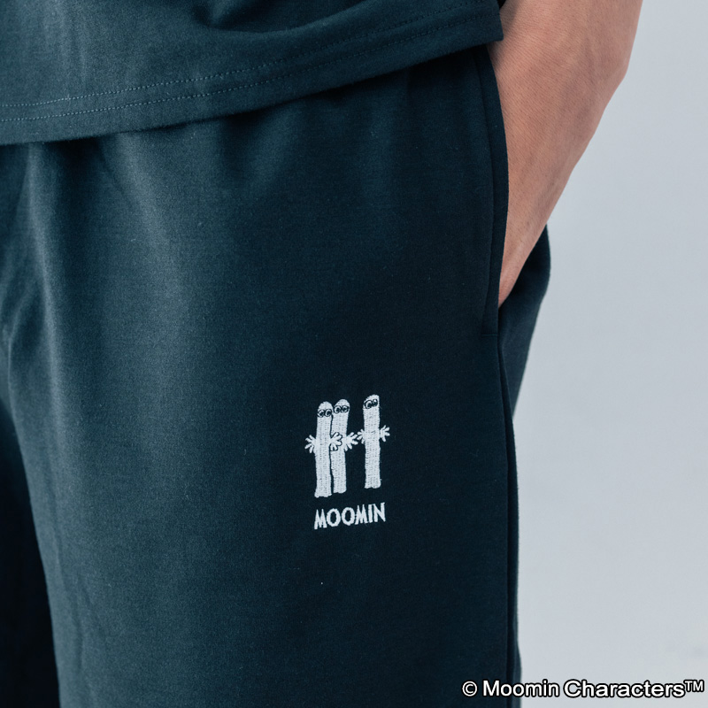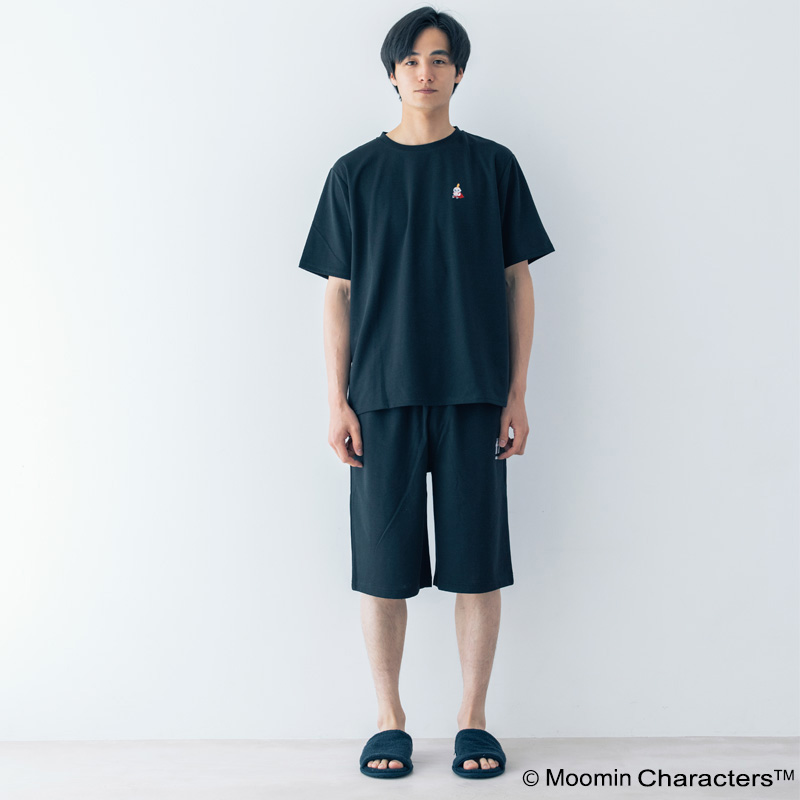 シックなブラックの上下セットでトップスの胸元にはリトルミイ、ボトムスにはニョロニョロと「MOOMIN」のロゴを刺繍。