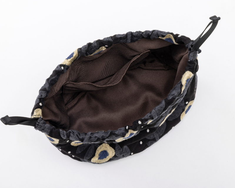 ショルダーバッグは、ころんとした丸みのあるシルエットが魅力で、底に向かってふんわりとふくらんだ形が、やわらかく女性らしい印象を演出してくれます。カジュアルな巾着型で、軽やかで持ちやすく、普段使いにもぴったり。すべてのモチーフが刺しゅうで表現されており、立体感と高級感を感じさせます。ひとつひとつの刺しゅうが丁寧に仕上げられており、クラフト感と上質さが融合したデザインです。