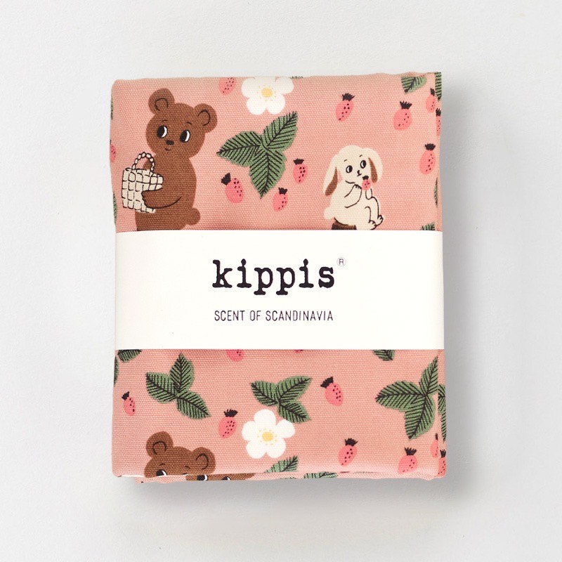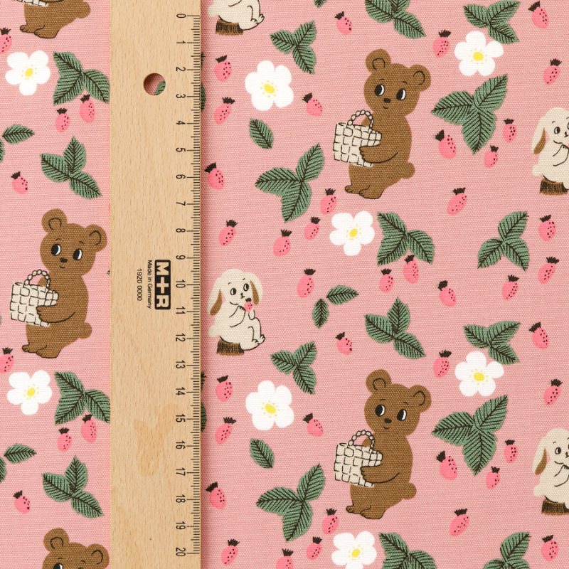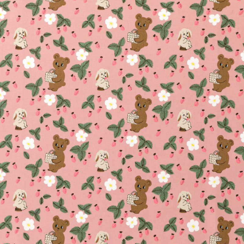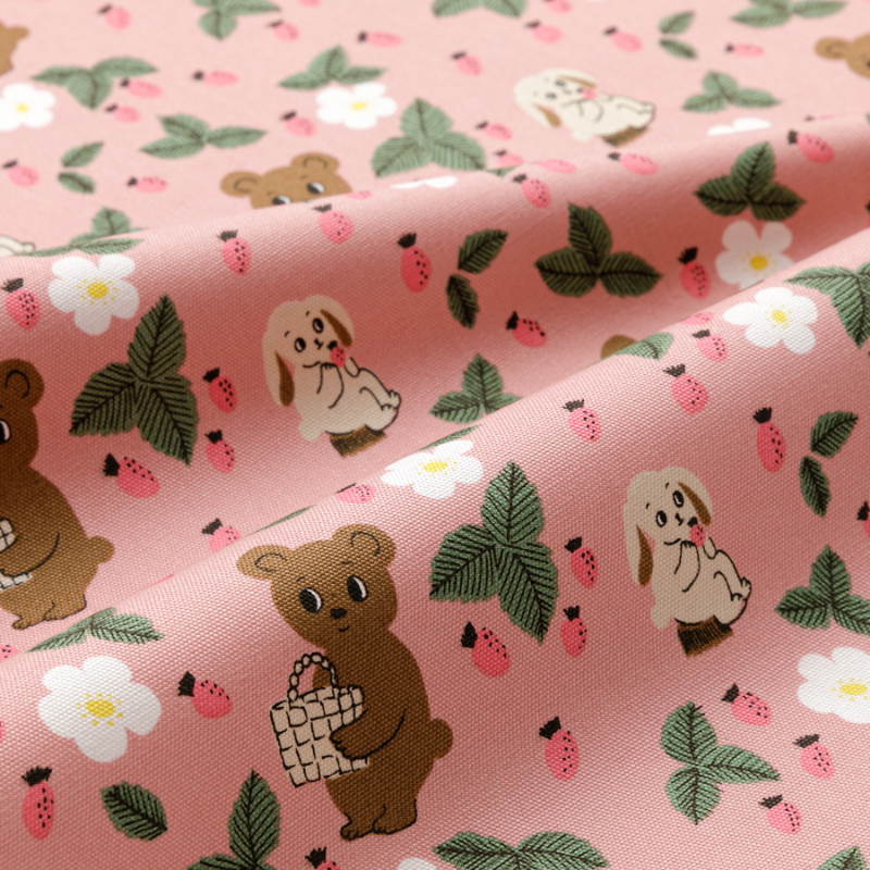 かごを抱えたくまと、垂れ耳がトレードマークのうさぎが、森でちょうど食べ頃のベリーを頬張っている様子。