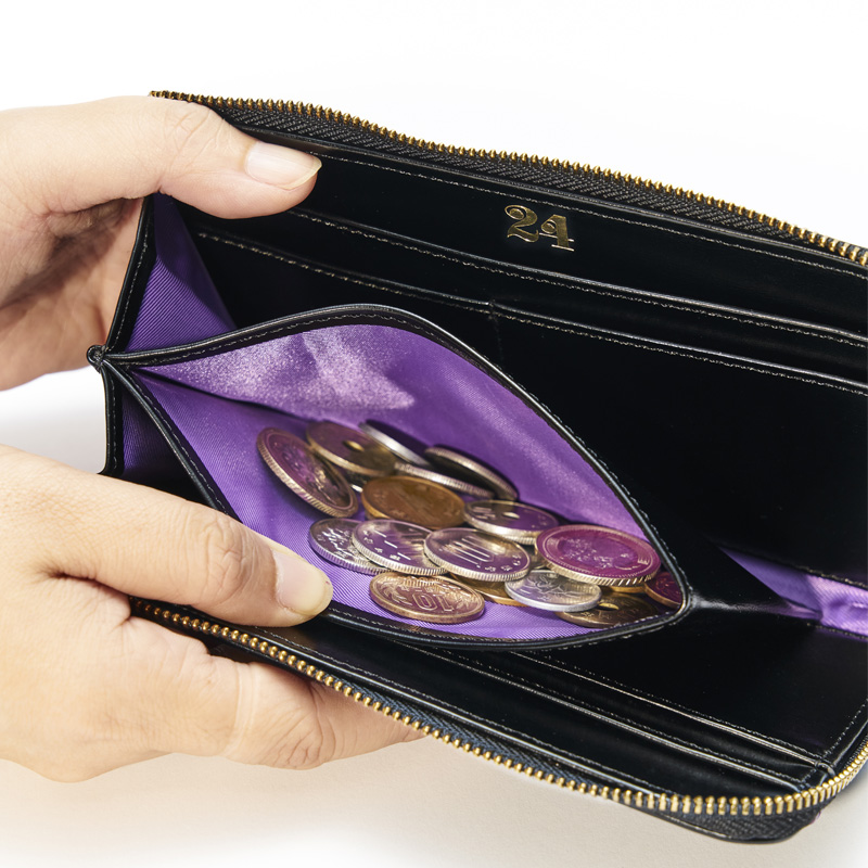 お金が逃げない色「パープル×ゴールドパーツ」で金運を呼び込みがっちり守る。