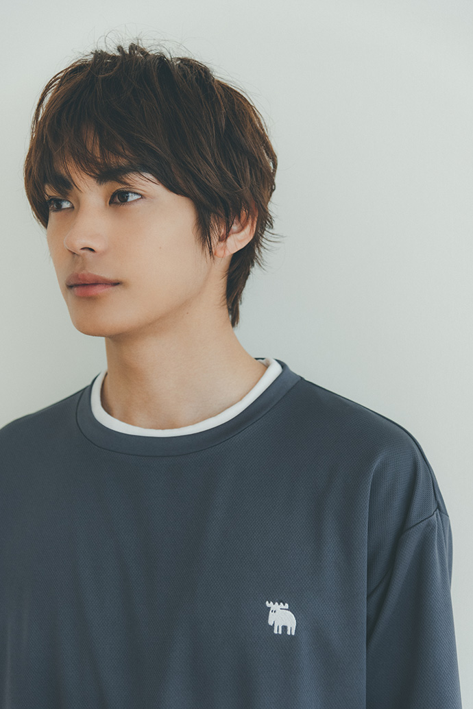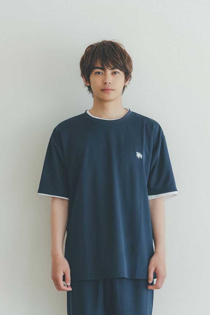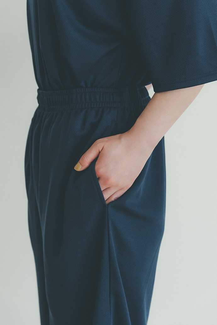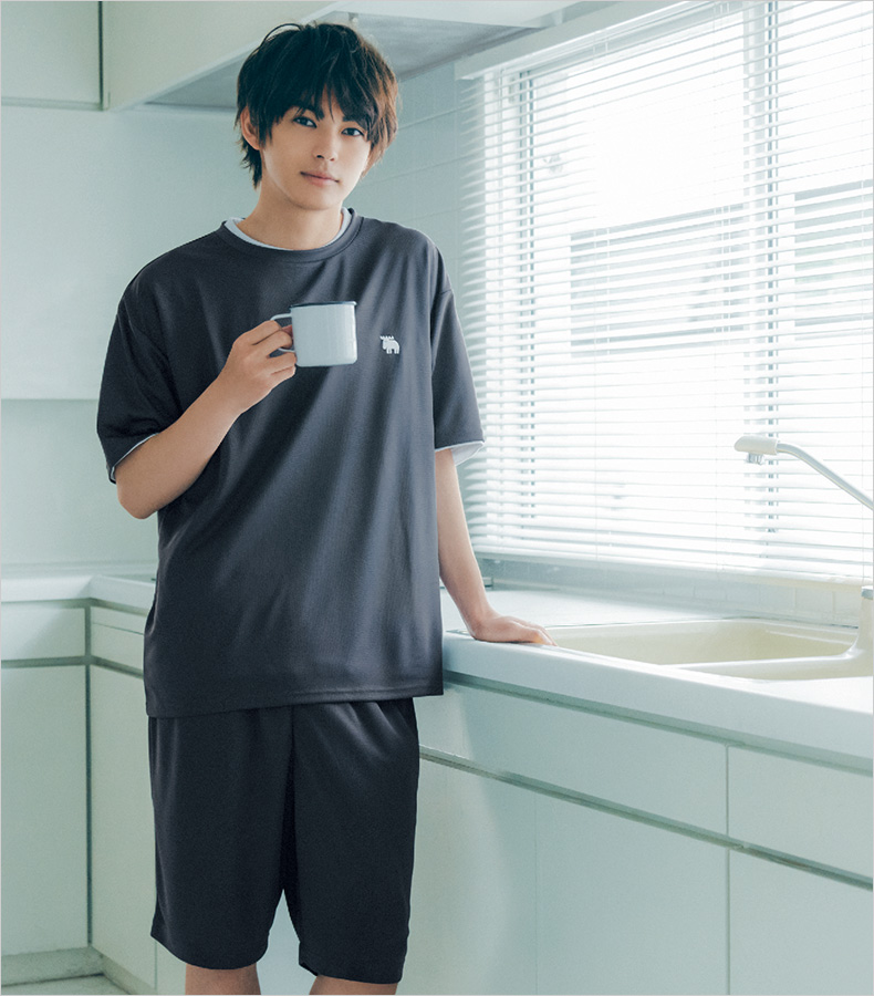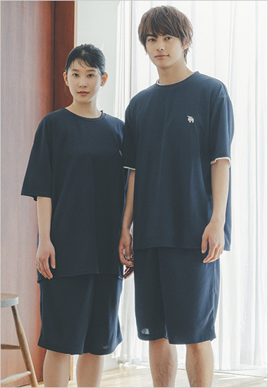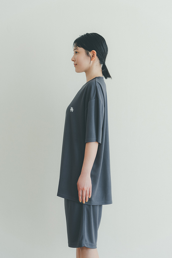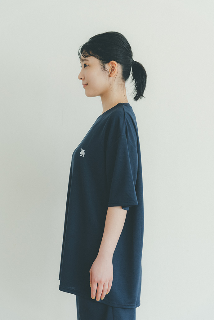 メッシュルームウェアを着用した外でのカット【MAN】トップス・パンツ/moz メッシュルームウェア ネイビー ver.、フラワーバッグ¥2,970 /スタン プロダクト(スタン ストア トウキョウ080-7632-8449)【WOMAN】トップス・パンツ/moz メッシュルームウェア チャコールグレー ver.、エコバッグ¥7,480/スタン プロダクト(スタン ストア トウキョウ080-7632-8449)