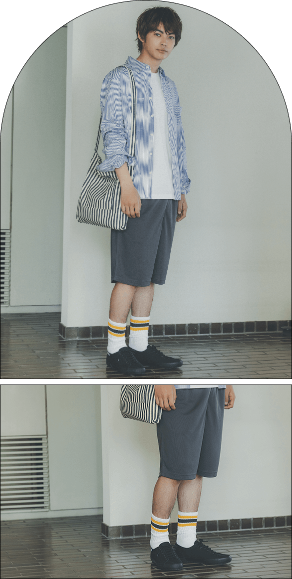 スポーティなメッシュショーツは、ソックス合わせで素足の分量を減らすことでタウン仕様に。爽やかな白トップスに襟付きのシャツを羽織れば、ぐっと大人っぽい印象に昇華する。ラフなのに上品なスタイリング。