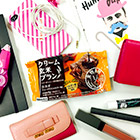 ニコルの普段のバッグの中身はこんな感じ。「小さめのバッグが最近はお気に入りだから、必要最低限のものしかどうしても持ち歩けない。だけどクリーム玄米ブランなら場所をとらないミニサイズだからいつでもどこでも栄養補給できて、ほんと助かっています」