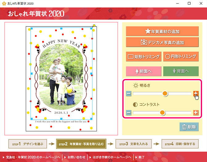 プレビューに表示されているデジカメ写真・年賀素材をマウスで選択(選択されたデジカメ写真・年賀素材は青線で囲まれます)し、画面右側にある「明るさ」「コントラスト」の「+」「-」ボタンをクリックするか、スライダーをドラッグすることで、明るさやコントラストの調整ができます。
