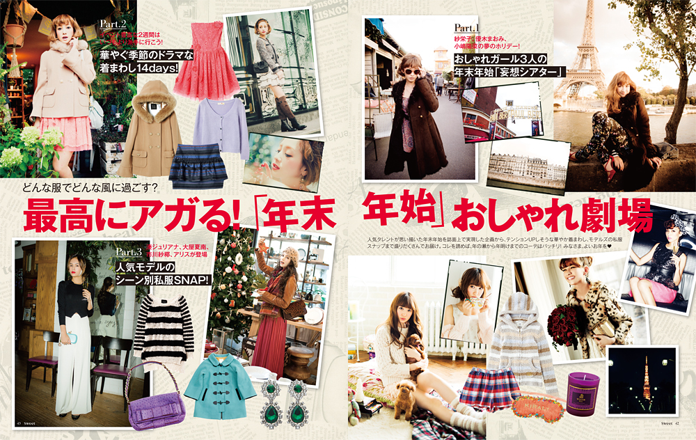 2012年がいい年だった人もそうでない人も、やっぱりこの時期は気合を入れて盛り上がっていきたいものです。そこで、今月号では「年末年始“妄想”おしゃれ劇場」という、何ともsweetらしい企画を皆様にお届けします。紗栄子、優木まおみ、小嶋陽菜の3名&スウィートモデルズが、「こんな風に過ごせたら素敵♥」と想いを巡らせた夢の年末年始を誌上で実現。あくまでも「妄想」なので、実際とはかなり異なるとは思いますが、それも含めてお楽しみいただけると幸いです。他、女優・石原さとみが旅するロンドン、スウィート特製福袋、最上級のご褒美ジュエリー、贈り物名人に聞くギフト、真冬のドラマティックメイクなどなど、年末年始を華麗に彩るコンテンツを各種取り揃えましたので、ぜひ手にとってください!